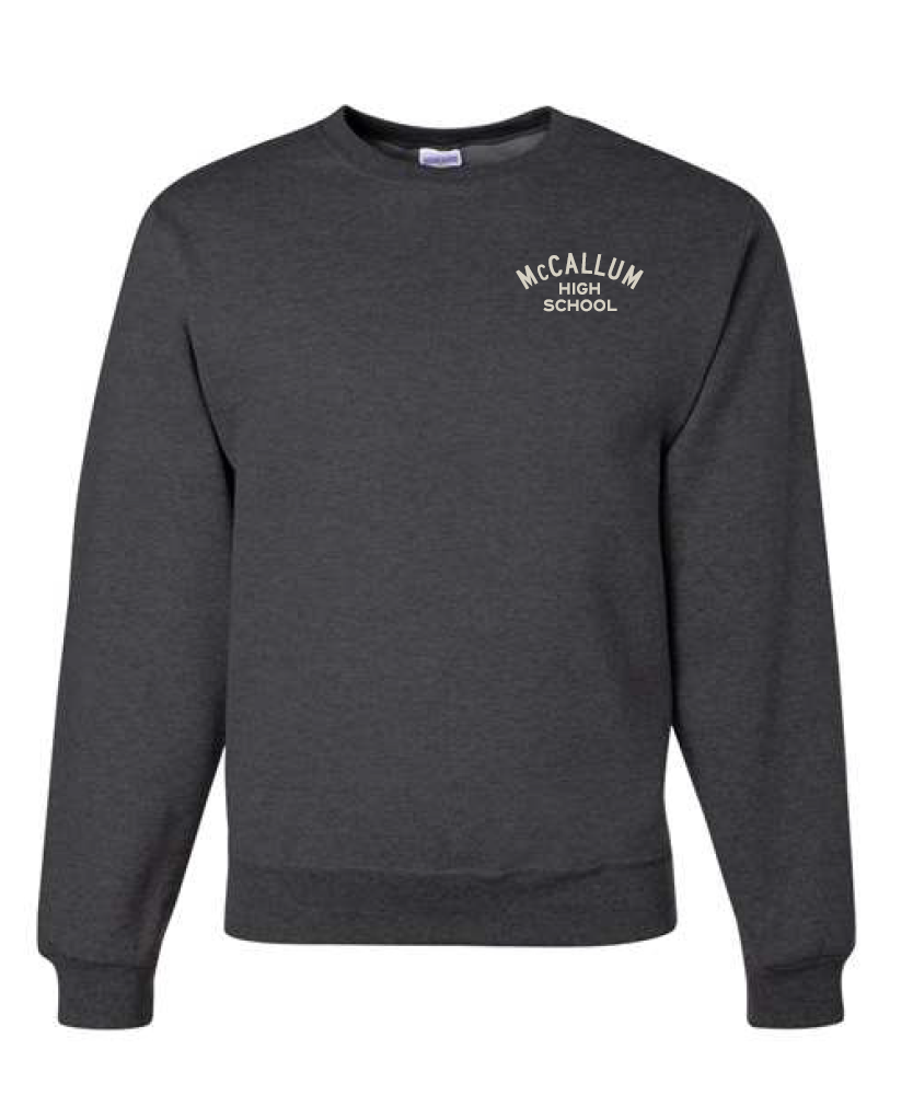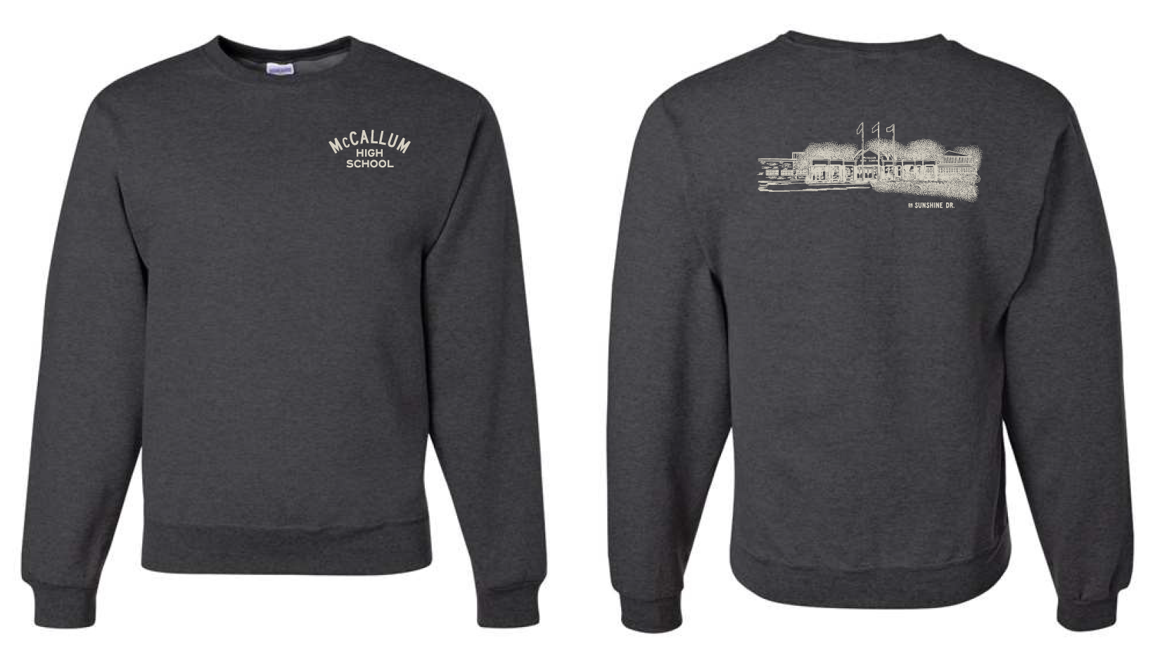 Charcoal gray sweatshirt with McCallum logo on front & architectural drawing on back.