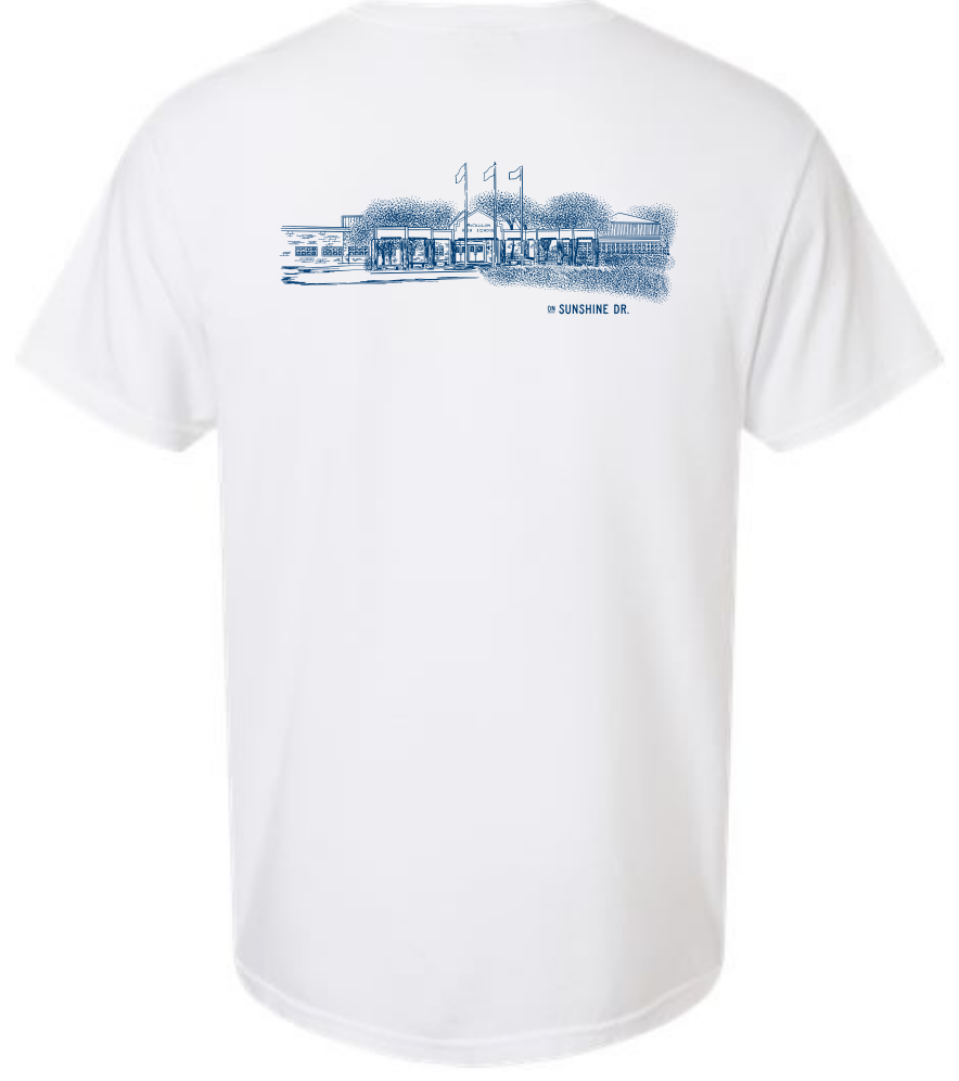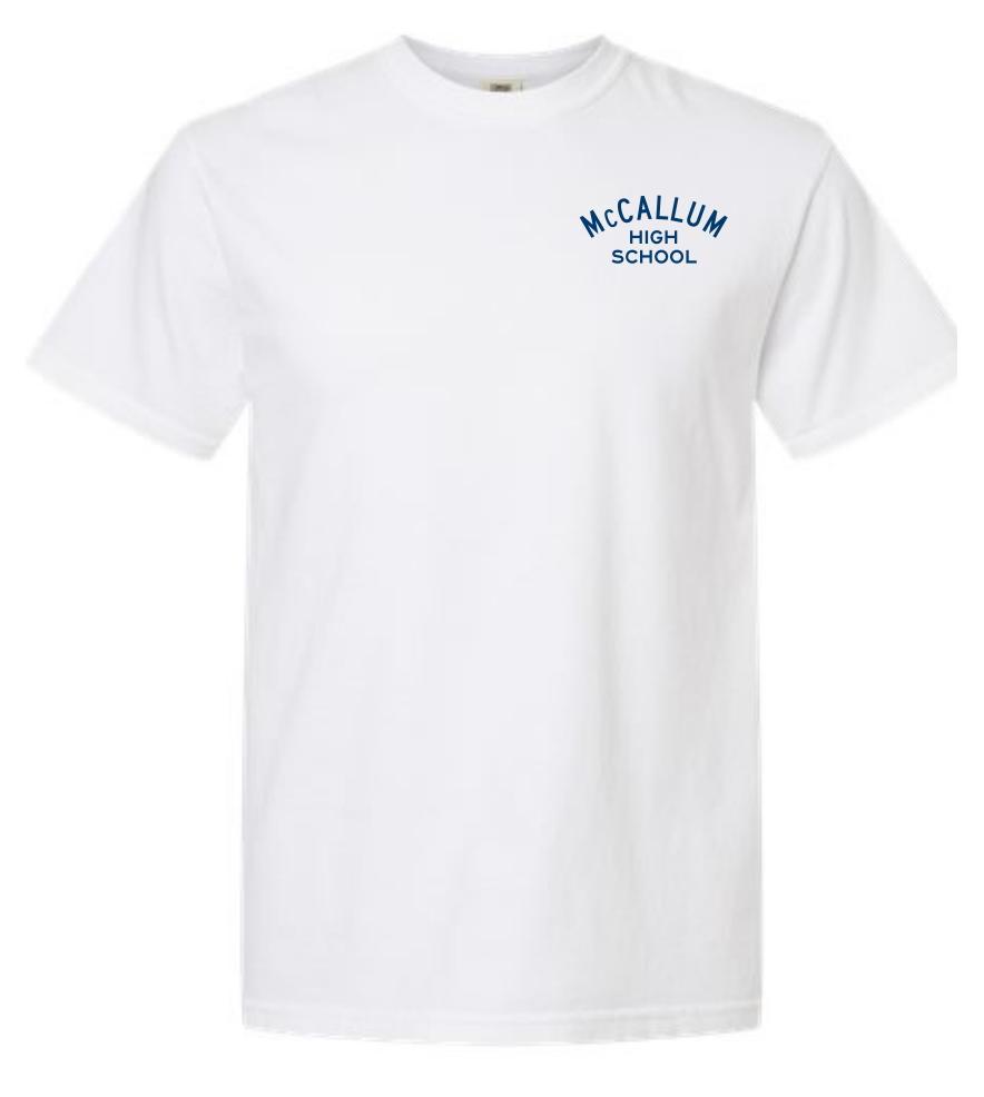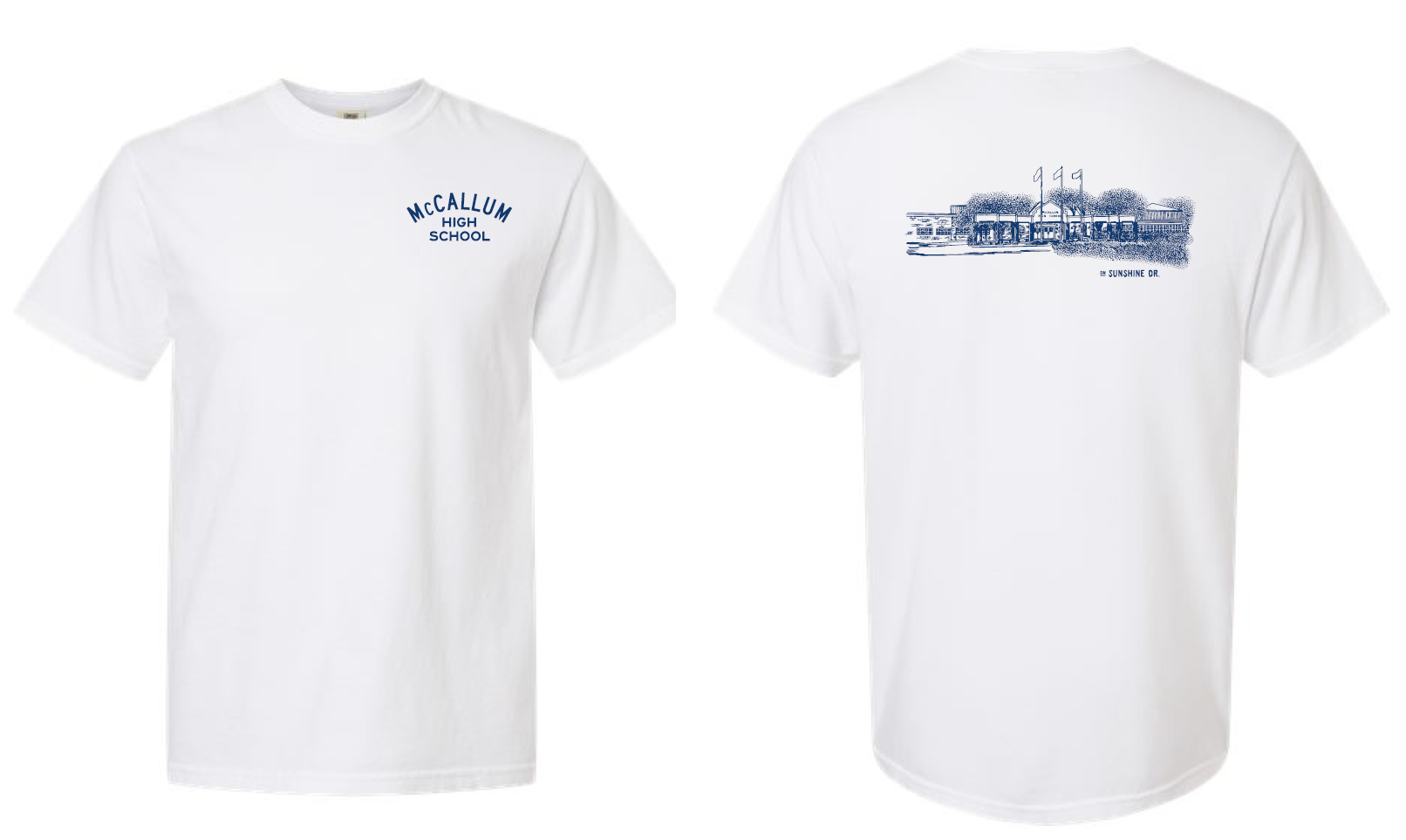 Very soft, short-sleeve t-shirt with architectural sketch of McCallum High School, 2025.