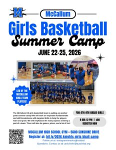 The McCallum HS girls basketball team is putting on another great summer camp! We will work on important fundamentals and skill breakdowns with targeted drills to help the players learn and grow. We will emphasize the many aspects of being a part of a team. There will also be games, prizes, and a lot of fun! June 22-25 for 4th-9th grade girls. Register now for Girls’ Basketball Camp!