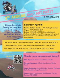 Bring the whole family for an afternoon of art, music, and community while supporting the McCallum Visual Arts Program. Enjoy live music by McCallum guitar majors, a silent auction, and complimentary light bites and drinks. Don’t miss the chance to explore and purchase incredible artwork created by our talented students, parents, and teachers!